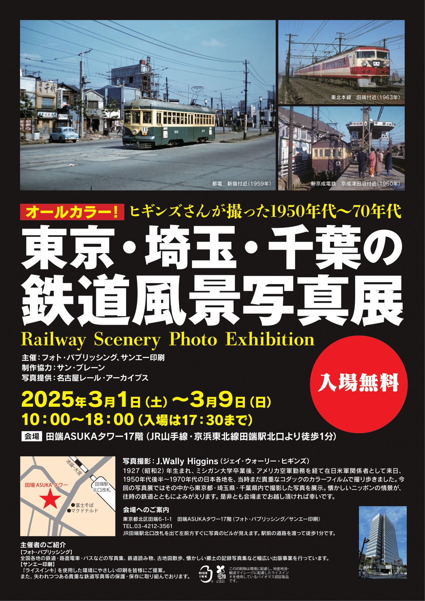 昭和から平成にかけて、国鉄・私鉄の鉄道風景や路面電車が走る懐かしい街角、歴史散歩、郷土の歴史、古地図案内などの書籍を編集・出版する 株式会社フォト・パブリッシング(所在地:東京都北区田端6-1-1 田端ASUKAタワー17階、代表取締役社長:岡村 和哉)は、サンエー印刷とともに、1950年代から1970年代の日本の鉄道風景を記録した J. Wally Higgins(ジェイ・ウォーリー・ヒギンズ)氏 の貴重なカラーフィルム写真を展示する写真展を、 入場無料 で開催中です。