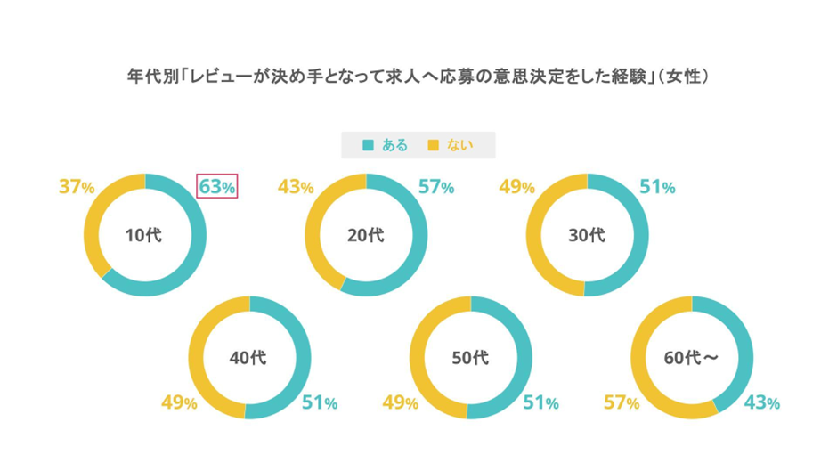 「レビューが決め手となって求人に“応募する/しない”を決めたことがある」と回答した方の割合は、男女ともに、年代が低いほど高い傾向が見られた。特に、10代女性のうち63%の方が「レビューが決め手で応募した/応募を辞めた経験がある」と回答した。