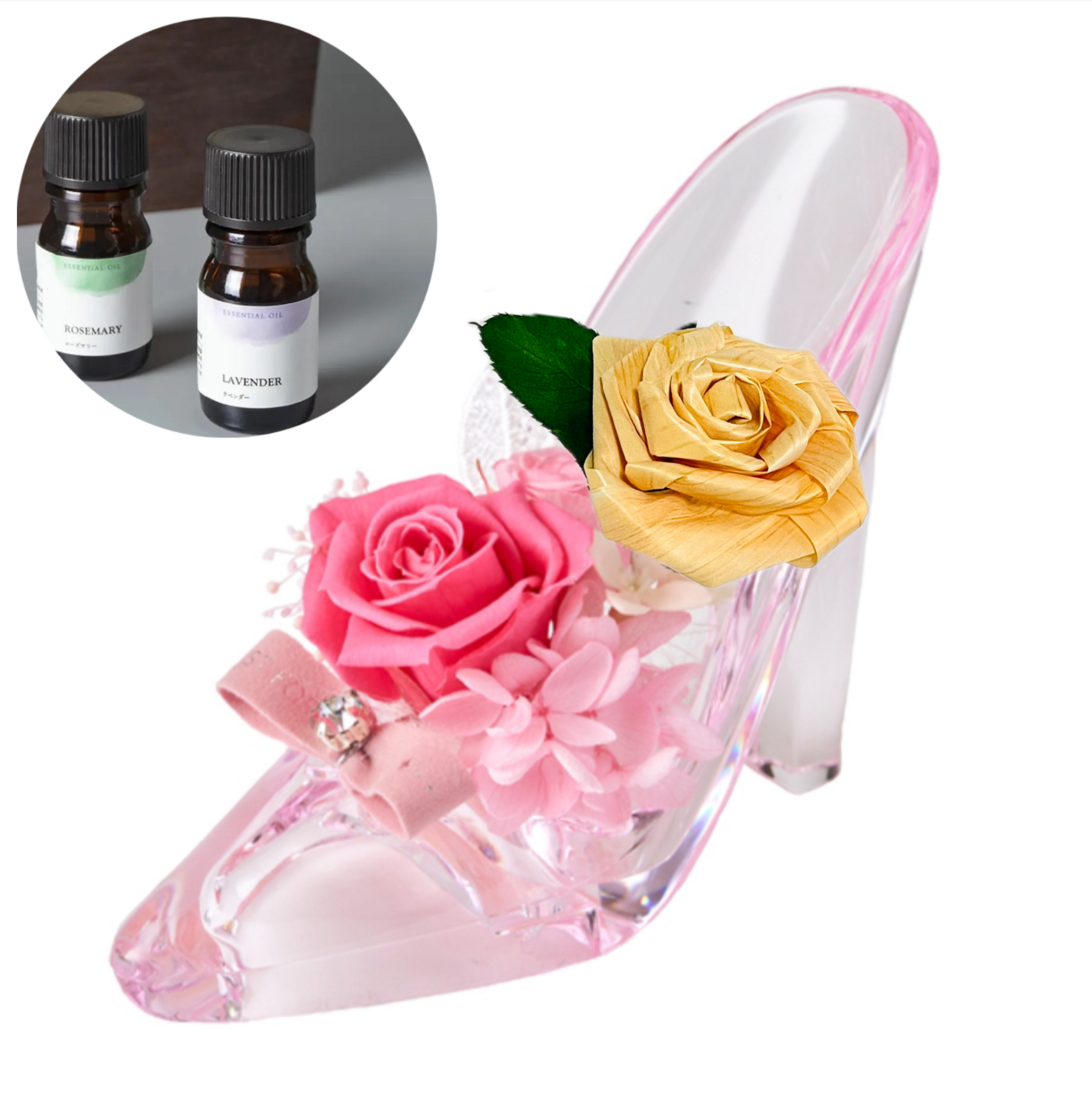 また、ギフトにお勧めなのが、「Aromaローズ」とプリザーブドフラワーをセットにしたアイテムです。ナチュラルなカンナフラワーと色鮮やかなプリザーブドフラワーを、キュートなアクリル製シューズにおさめており、エッセンシャルオイルもプラス。コンパクトサイズなのでどこにでも置きやすく、誕生日や母の日・父の日など特別な日に贈れば喜ばれること間違いなしです。