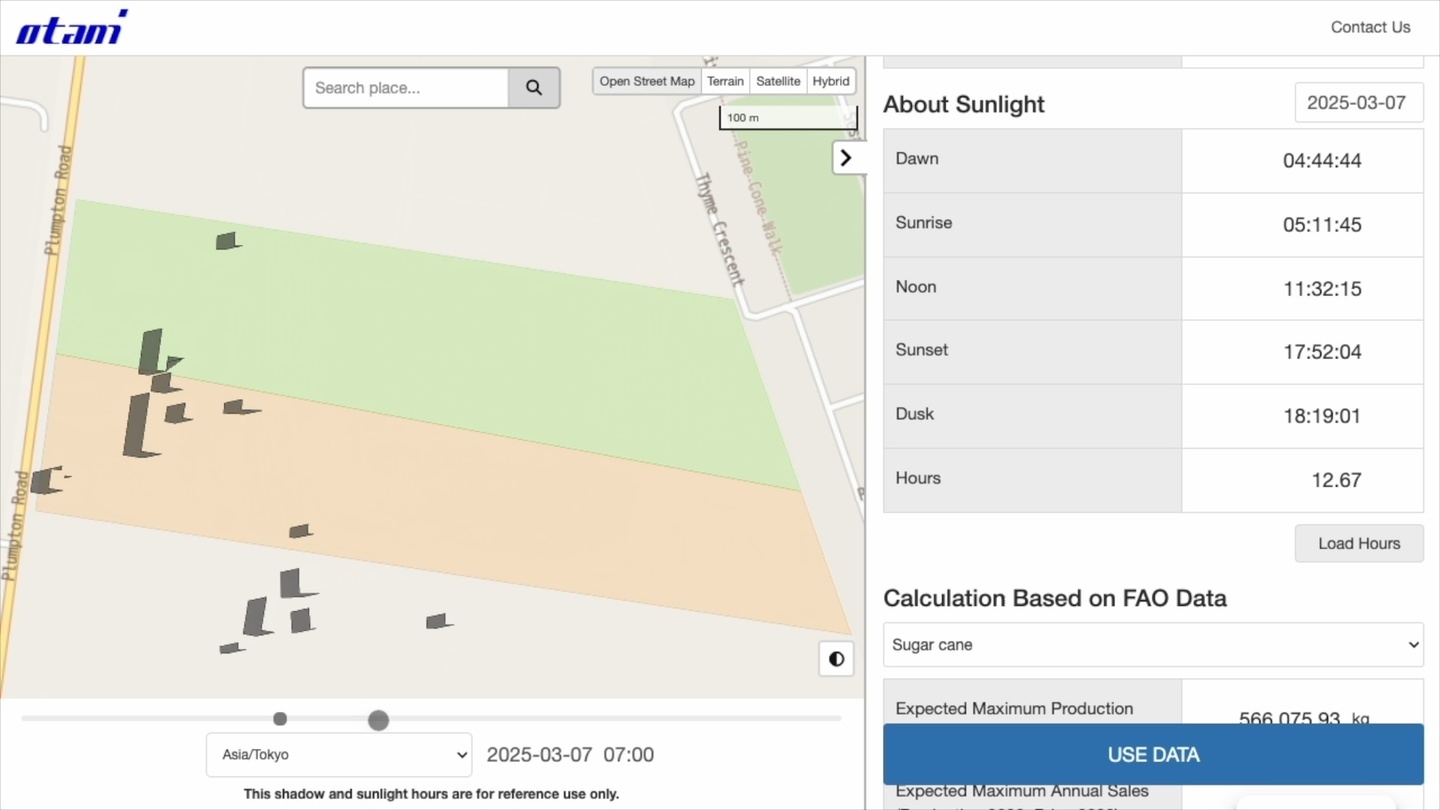 株式会社おたに(横浜市、代表:小谷祐一朗)は、農業データサービスに新たな機能が追加されました。このサービスは、農地表面温度、農地植生指数(NDVI)、農地水分指数といった重要な農業指標を即座に提供します。今回のアップデートでは特定の農地における影の形状と日照時間を計算できる機能を追加しました。