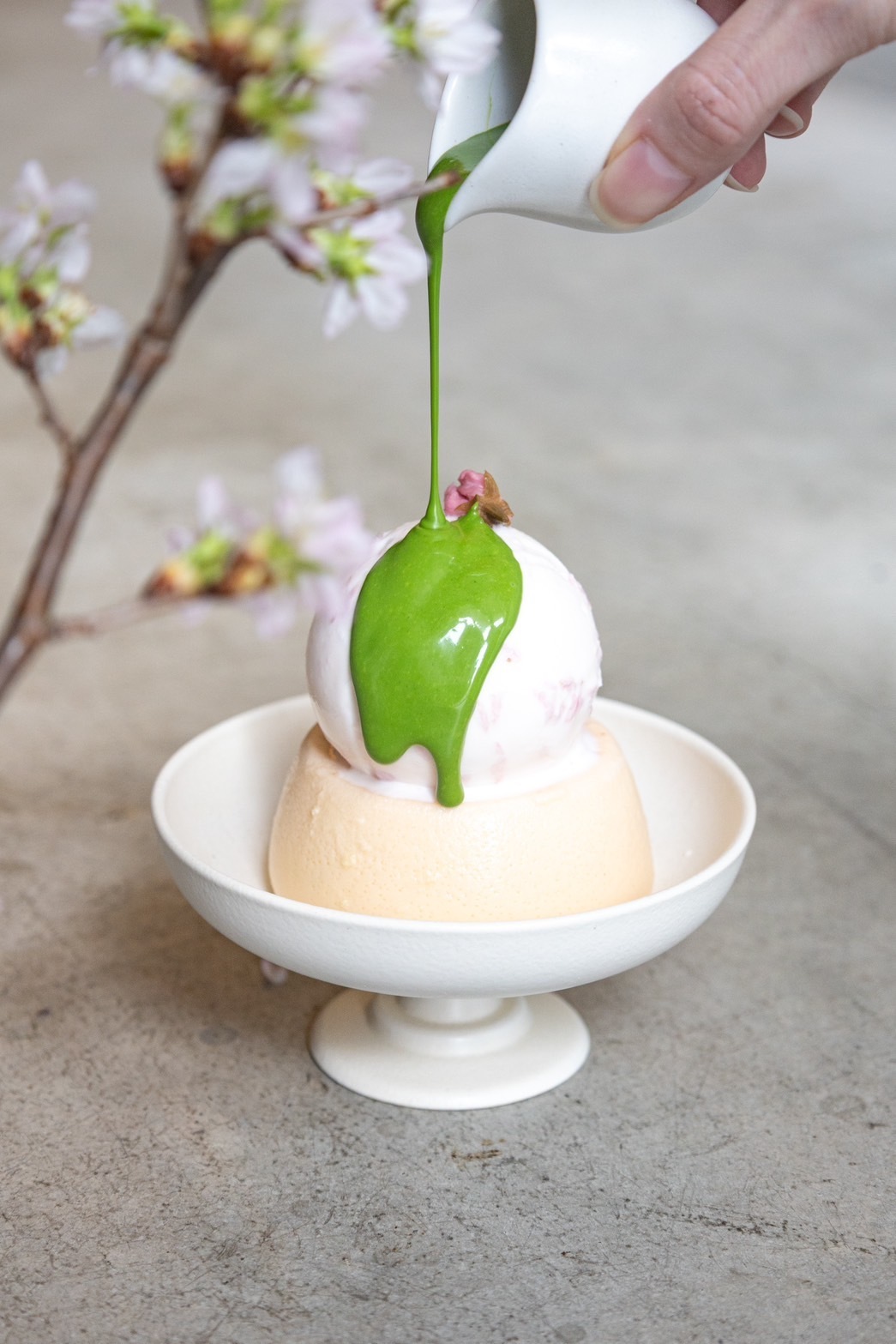 マスカルポーネのコクとなめらかな口当たりに、桜あんの優しい甘さと香りを加えたプリン。桜のアイスと塩漬けの桜を添えて華やかに仕上げました。