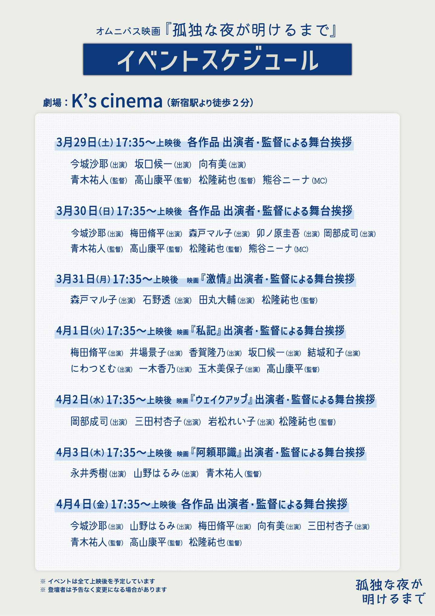 3月29日(土)から4月4日(金)までケイズシネマ新宿にて上映されるオムニバス映画『孤独な夜が明けるまで』の上映後に出演者・監督による舞台挨拶が連日開催されることが決定しました。