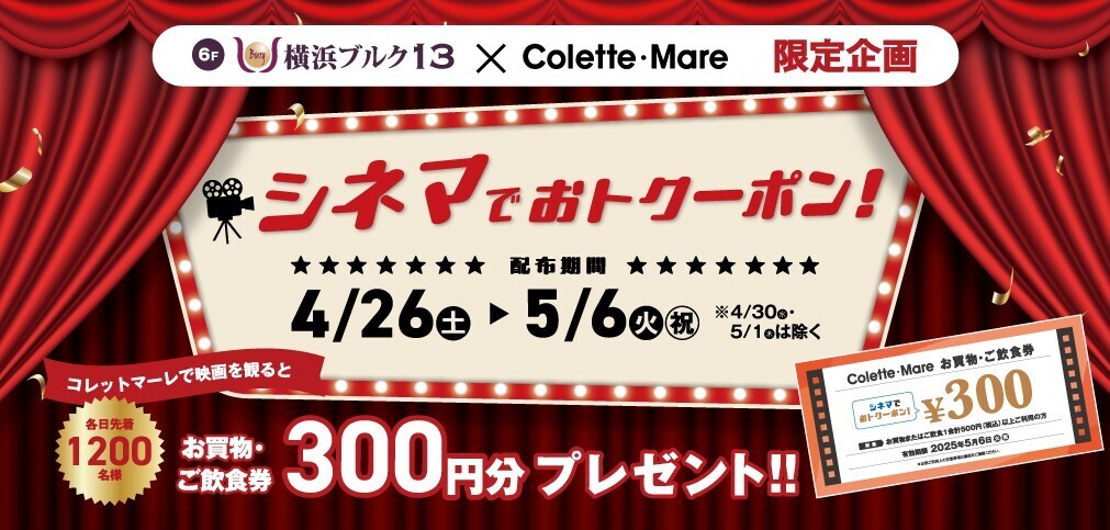 4月26日(土)~5月6日(火・祝)の期間中、コレットマーレ 6F 横浜ブルク13にご来場いただいた各日先着1,200名様に、コレットマーレで使えるお買物・ご飲食券300円分をプレゼント!