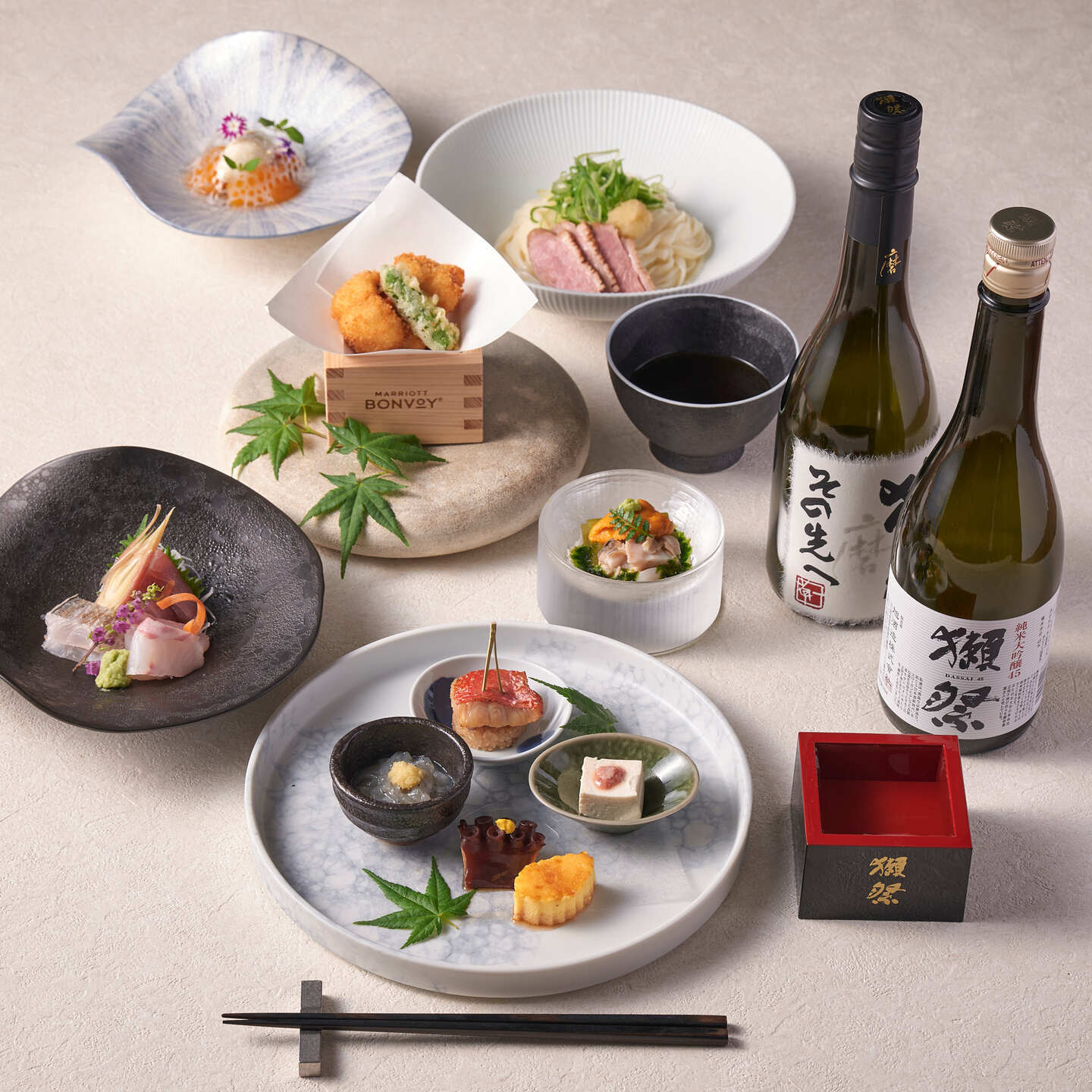 日本酒は、究極の精米技術によって生まれる希少な『獺祭 磨き その先へ』をはじめ、『新生獺祭 純米大吟醸 磨き二割三分』『獺祭 純米大吟醸 磨き二割三分』『獺祭 梅酒 純米大吟醸磨き二割三分仕込み』『純米大吟醸 磨き二割三分 獺祭 美酔』など、5種をご用意し、それぞれの味わいの奥深さや違いを心ゆくまでご堪能いただけます。
