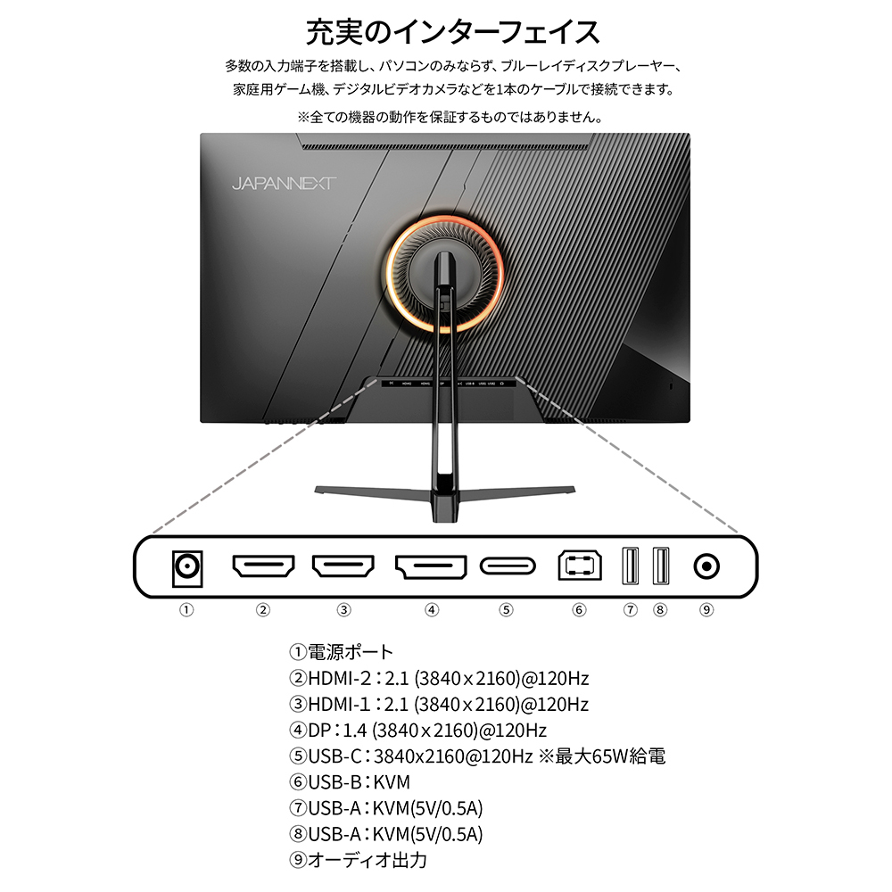 | 入出力端子 | HDMI 2.1 x2 (120Hz) DisplayPort 1.4 x 1 (120Hz) USB Type-C x1 (120Hz/最大65W給電) オーディオ出力×1 |