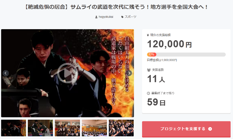 依然として続く居合道存続の危機に当会が先導して対抗すべく、今大会では流派や会派を問わず、東京で開催される同大会へ挑戦する地方選手の遠征費として1人あたり2万円の支援を目標に、クラウドファンディングを立ち上げました。