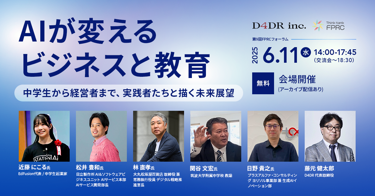 D4DRのシンクタンク部門FPRCによる「FPRCフォーラム」の開催が決定しました。今回は、大企業から教育現場まで、第一線で活躍する実践者をゲストに迎え、幅広い視点から、AIが変えるビジネスと教育の未来について議論します。