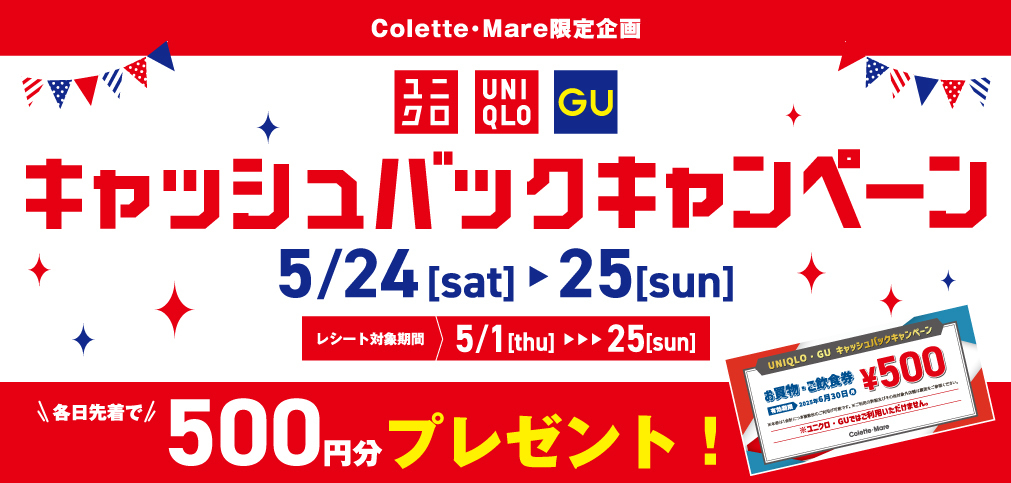 コレットマーレでは5月24日(土)~5月25日(日)の2日間、”ユニクロ・GUキャッシュバックキャンペーン”を開催します!各日先着でコレットマーレでご利用いただける500円分のお買物・ご飲食券をプレゼント!さらに!Wキャッシュバックのチャンス!対象店舗のお買上げレシート提示で追加で500円分キャッシュバックします!