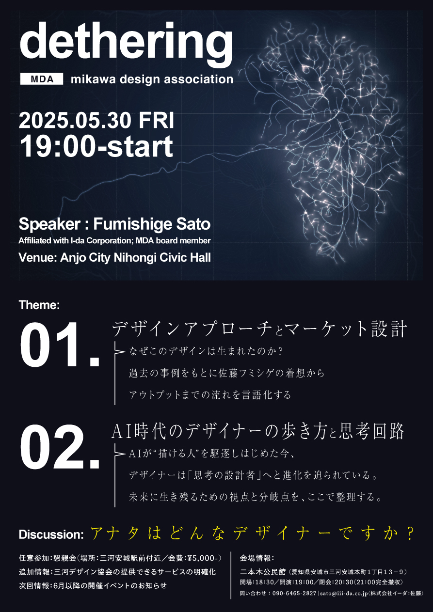 三河エリアを拠点とするデザインネットワーク「三河デザイン協会(MDA)」が主催する、定例イベント[dethering(デザリング)]。第4回となる5月の開催が決定しました。今回のテーマは、[第一部]デザインアプローチとマーケット設計 と [第二部]AI時代のデザイナーの歩き方と思考回路の二本立てで開催。