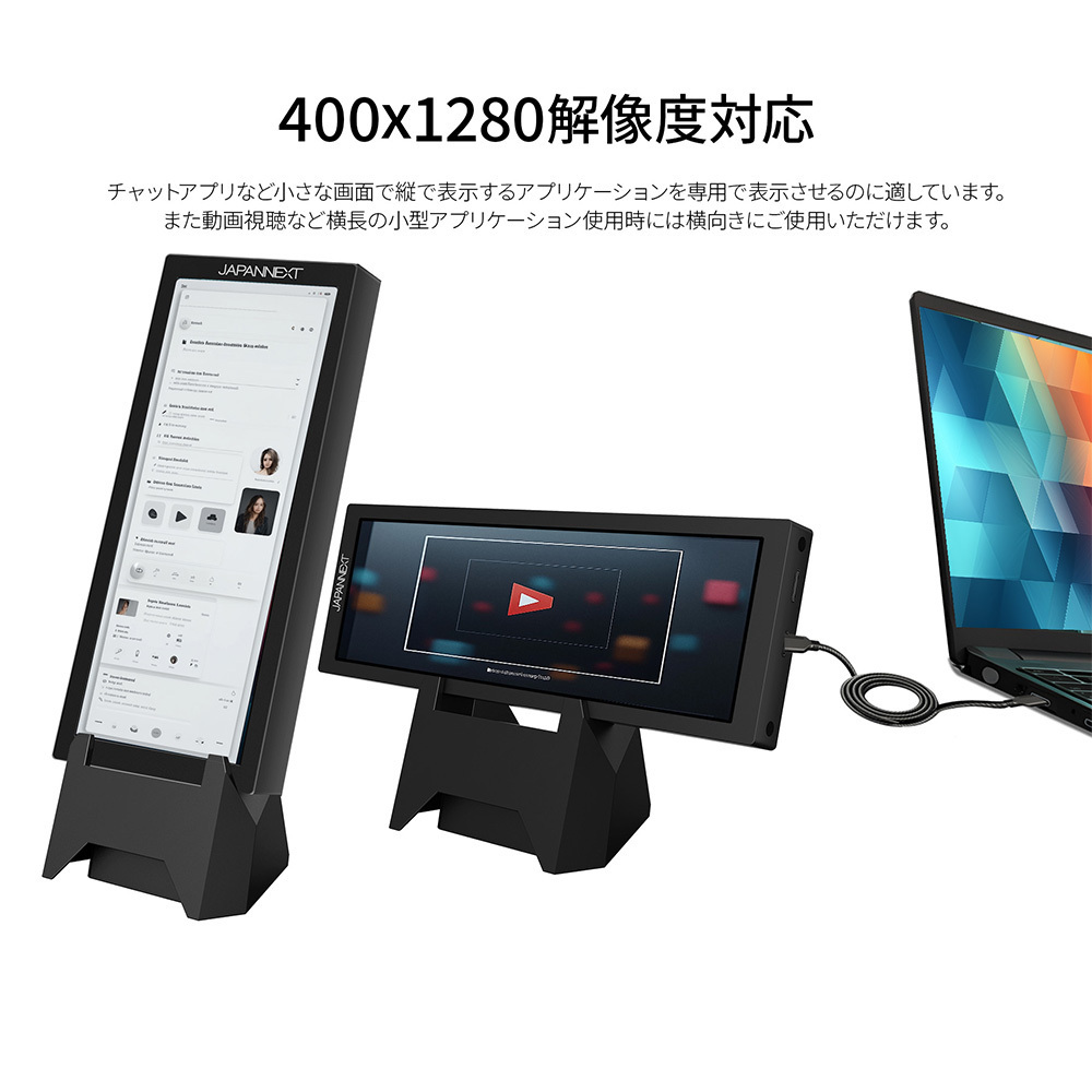 PCと接続して、チャットアプリなど縦表示に適したアプリケーションを常時表示させる用途に最適です。また、スタンドは横向きでも使用できるため、動画視聴など横長コンテンツを表示したい場合には横画面での使用も可能です。
