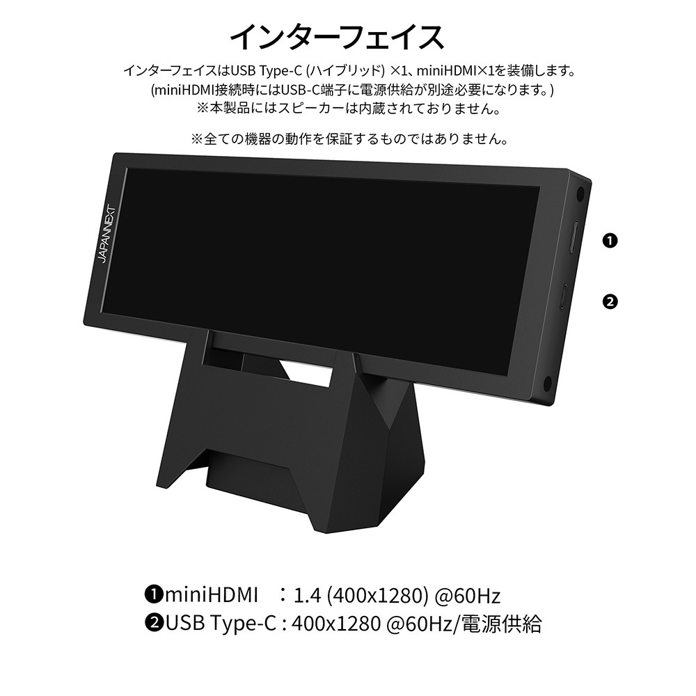 インターフェイスはUSB Type-C (ハイブリッド) x1、miniHDMI x1を装備します。*miniHDMI接続時にはUSB-C端子からの電源供給が別途必要になります。