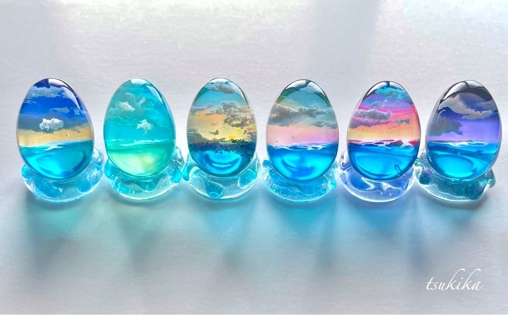 3~7cmという小ぶりなレジン型の中に、無限に広がるような空と海を中心に風景を生み出しているtsukika。つるんとした卵型から、角度によって見え方を変える鉱石型まで、一貫しているのは「手の平サイズの小さな景色」というコンセプトだ。その美しさに加え、作品内に閉じ込める様々なパーツを粘土から手作りすることもあるというオリジナリティの高さで、ファンを魅了している。minneを中心としたオンライン販売では完売を繰り返しており、「泣きたくなるような美しい風景」「海のさざ波が聞こえてきそう」と、心を動かしている。