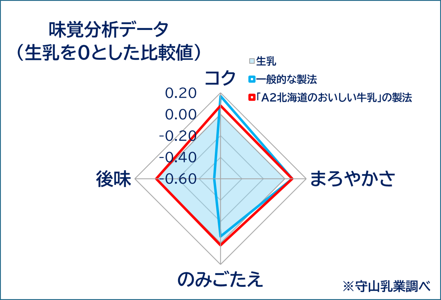 生乳の分析値を0として、一般的な製法と「MORIYAMA A2北海道のおいしい牛乳」の製法を比較したグラフです。一般的な製法と比較して、生乳本来の風味により近い味わいですので、これまで牛乳が合わなかった方にも、ぜひお試しいただければ幸いです。
