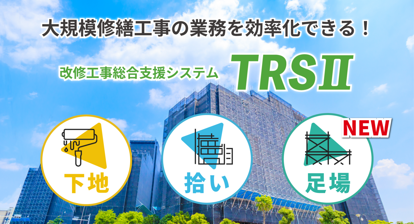株式会社システムズナカシマ(本社:岡山県岡山市、代表取締役社長:中島 義雄)は、ビル・マンションなどの大規模修繕工事を行う事業者向けに、改修工事総合支援システム『TRSⅡ』シリーズの第3弾『TRSⅡ 足場』を2025年6月1日に発売します。2023年に提供を開始した『TRSⅡ 下地』『TRSⅡ 拾い』に続き、新たに足場仮設計画機能を搭載した『TRSⅡ 足場』を加えることで、工事の図面作成から数量積算まで、改修工事全体のDXを推進します。
