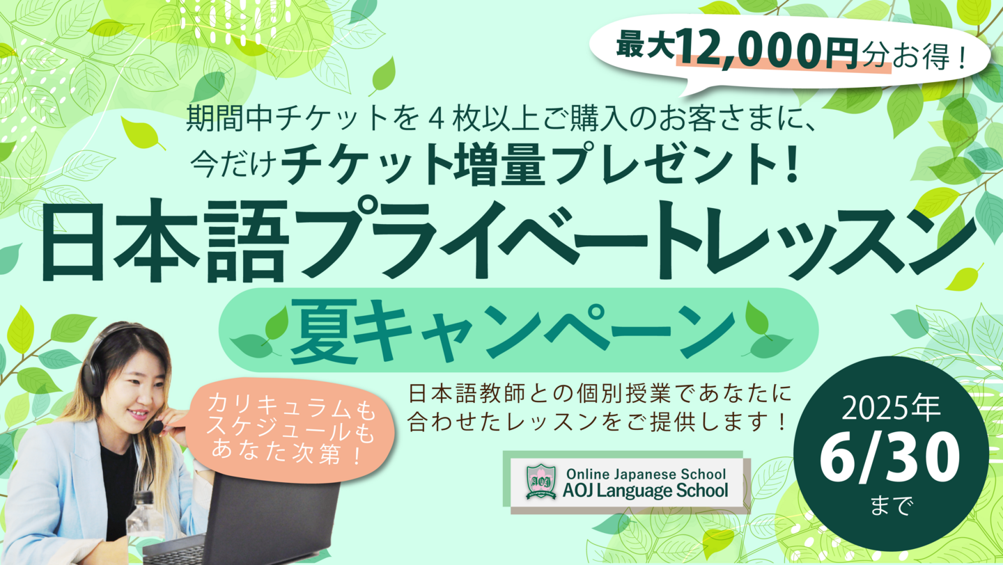 N5からN1までの全てのレベルに対応した学習から模擬試験までを網羅したオンライン日本語教材や、オリジナルの模擬試験パックは、無料体験も承っております。また、チケット制の日本語教師によるマンツーマンレッスンは、6月30日まで限定でチケット増量キャンペーンを実施しております。試験直前の効率的な学習のために、是非ご活用ください。