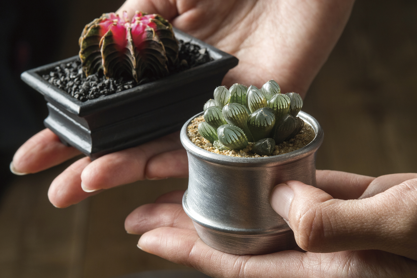 ■重厚感と質感 : 全て鋳造で製造することで、インダストリアルな雰囲気と、長く使える堅牢性を実現しました。アルミ素材特有のクールな質感が、植物本来の荒々しさや力強さを際立たせます。