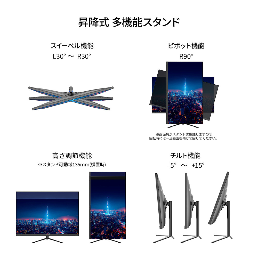 高さ調整が可能な昇降式多機能スタンドを搭載、最大135mmの範囲(横置時)で最適な高さに画面を調整可能です。また縦画面として使用出来るピボット(回転)機能にも対応します。スイーベル(首振り)機能は、左右各30°の範囲で動かせます。