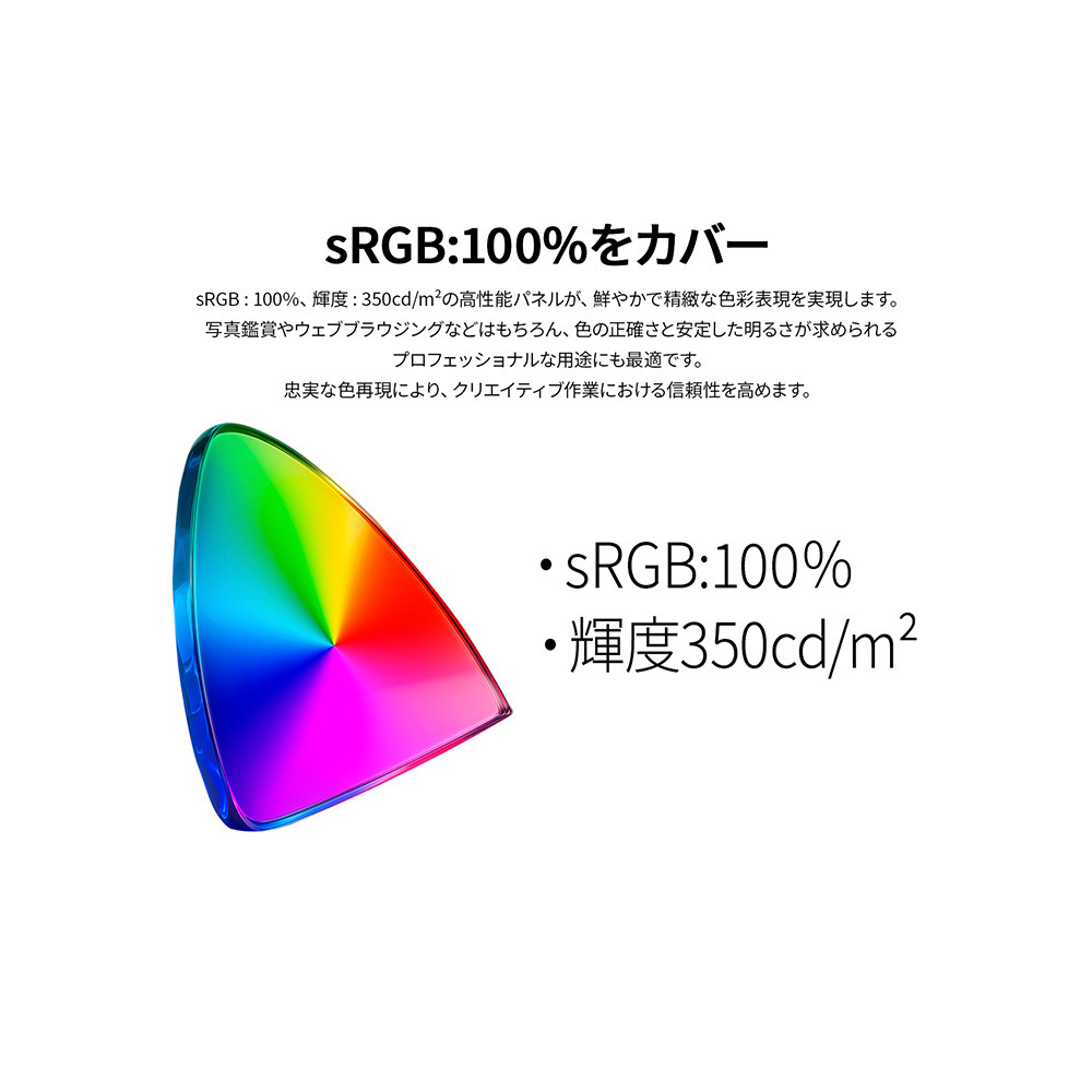 最大輝度350cd/m2の液晶パネルは、sRGB:100%の広色域に対応し写真や動画編集などの作業にも最適です。