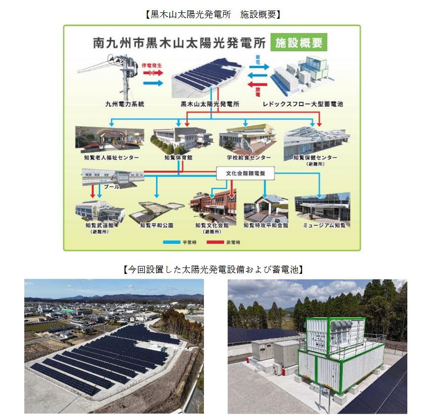 今回の取り組みは、南九州市が目指す「ゼロカーボンシティ」の一環で、太陽光発電設備((発電容量:1,000kW)と、九州の自治体では初めてとなるレドックスフロー蓄電池(蓄電容量:1,125kWh、定格出力:250kW)を設置しました。発電された再生可能エネルギーは、知覧特攻平和会館や学校給食センターなど、南九州市内10箇所の公共施設に供給され、余剰電力については、蓄電池を活用することで効率的な運用を目指します。また災害時には、指定避難所へ優先的に電力を供給する仕組みを構築しており、災害レジリエンスの強化にも貢献しています。尚、蓄電池は高い安全性と長い寿命が特徴のレドックスフロー蓄電池を採用し、先進的なエネルギーシステムを構築しました。