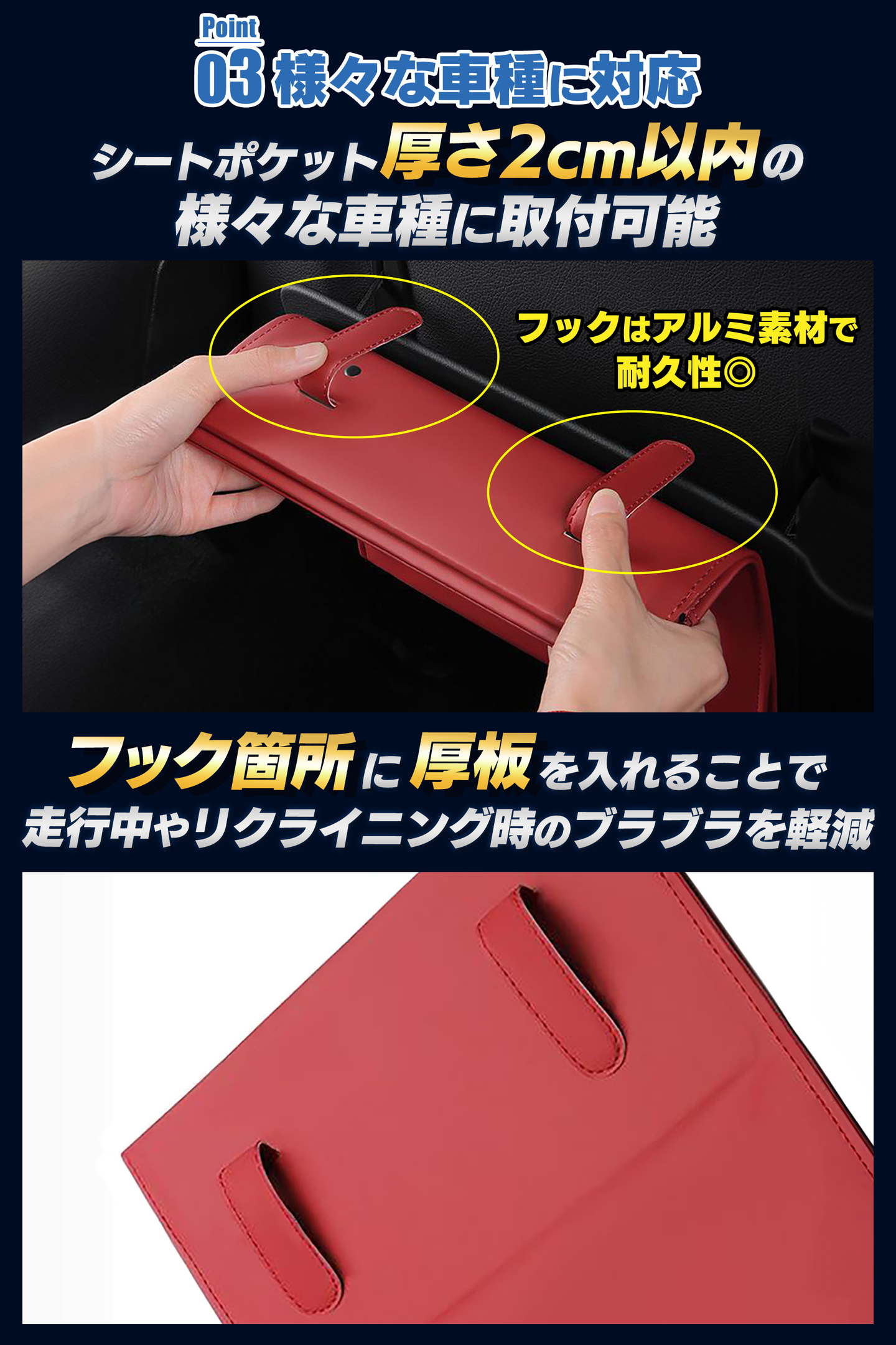 シートポケットの厚さが2cm以内であれば、あらゆる車種に取り付け可能です。フックには耐久性に優れたアルミ素材を採用し、さらにフック箇所には厚板を内蔵。走行中の揺れやシートリクライニング時のブラつきを抑え、抜群の安定感を発揮します。商品には専用ゴミ袋20枚も付属しており、購入後すぐにご利用いただけます。