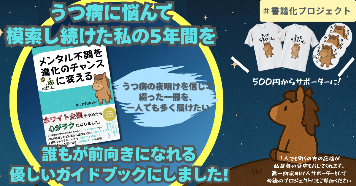 5年間のメンタル不調と引きこもり生活を経て社会復帰を果たした元大手企業の営業マン・衣月(Izuki)氏が、自身の体験と回復の知恵をまとめた書籍『メンタル不調を進化のチャンスに変える』を発表。現在、一人でも多くの”夜明け人”に届けるための広報費を募るクラウドファンディングをCAMPFIREで実施中です。本書は単なる体験談ではなく、知識編・実践編・応用編の3部構成からなる“やさしい回復実践ガイド”。支援者には内容が拡充された完全版PDFの提供やグッズリターンも。間もなくKindleでの先行公開を予定。心の不調を抱える当事者やその家族・支援者に寄り添う一冊を、あなたの手で届けてください。