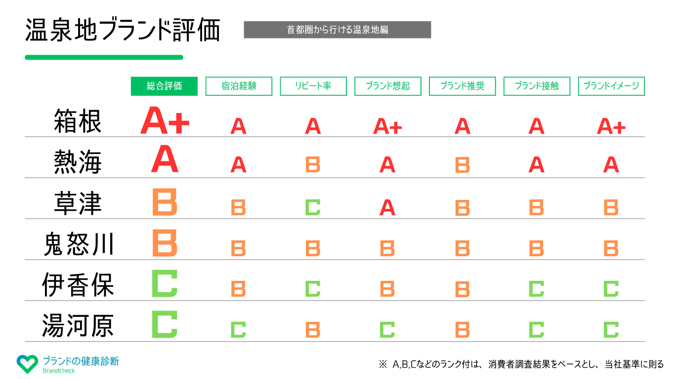 「ブランドの健康診断 Brandcheck」は首都圏在住者を対象とした、温泉地に関するブランド調査の結果を公表。箱根エリアが最高評価の「A+」を獲得したことを発表しました。