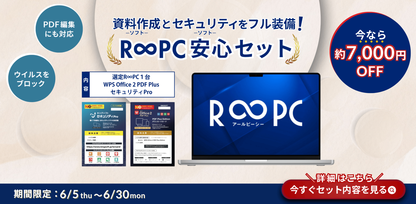 リユースPC事業を展開するリングロー株式会社(本社:東京都豊島区、代表取締役:碇敏之、以下「リングロー」)は、公式オンラインストア「R∞PCダイレクト(アールピーシーダイレクト)」にて、リユースパソコン「R∞PC(アールピーシー)」および「R∞PC LIGHT(アールピーシーライト)」の購入者向けに、仕事にもプライベートにもすぐに使える実用ソフトを2本セットで搭載したキャンペーンを、2025年6月5日(木)より開催します。「中古パソコンはソフトが入っていないから不安」「買ってから使えるまでに時間がかかる」——そんな声にお応えして、資料作成からセキュリティ対策までを“最初からフル装備”した安心セットをご提供します。