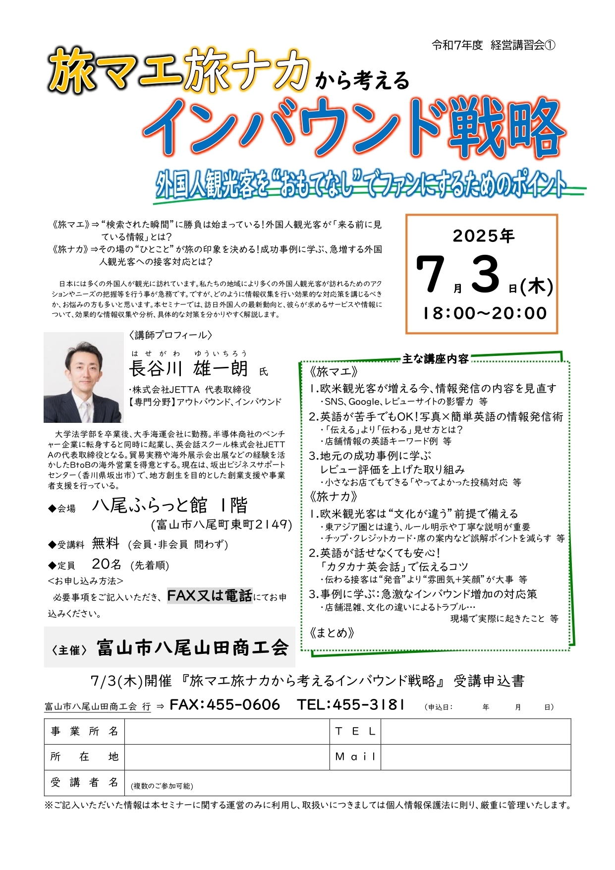 旅マエ旅ナカから考えるインバウンド戦略セミナーのご案内(富山市八尾山田商工会主催)