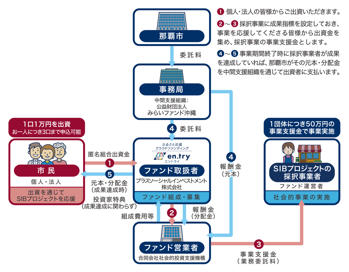 プラスソーシャルインベストメント株式会社(代表取締役社長 野池雅人、京都市)は、那覇市版SIBの2つのプロジェクト(1口金額1万円)を組成し、2025年6月27日から社会的投資の手法を用いたふるさと応援クラウドファンディング「エントライ」で出資者を募集します。那覇市版SIBは、市民からの出資を事業資金として市民活動団体がSDGs達成につながるプロジェクトを実施し、あらかじめ設定した成果目標を達成した場合、那覇市が出資金の元本・分配金を市民に支払う資金循環の仕組みです。市民活動団体は、行政の直接的助成では得られない出資者という応援団を得ることができ、市民は、出資することで主体的に地域課題に向き合い課題解決の当事者となっていくことを狙いとしています。6月29日(日)には、那覇市現地とオンライン同時開催での出資説明会を開催し、詳細をご説明します。