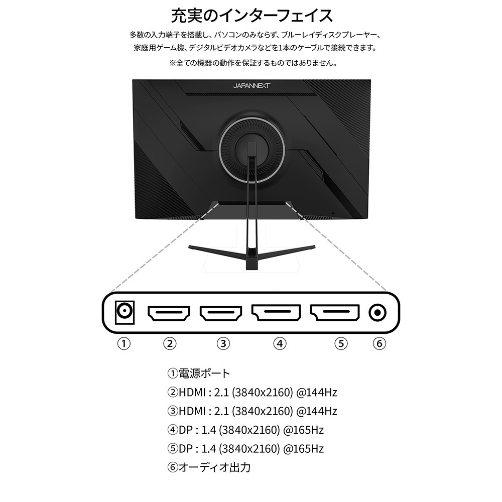 | 入出力端子 | HDMI 2.1 x2 (144Hz) DisplayPort 1.4 x 2 (165Hz) オーディオ出力×1 |