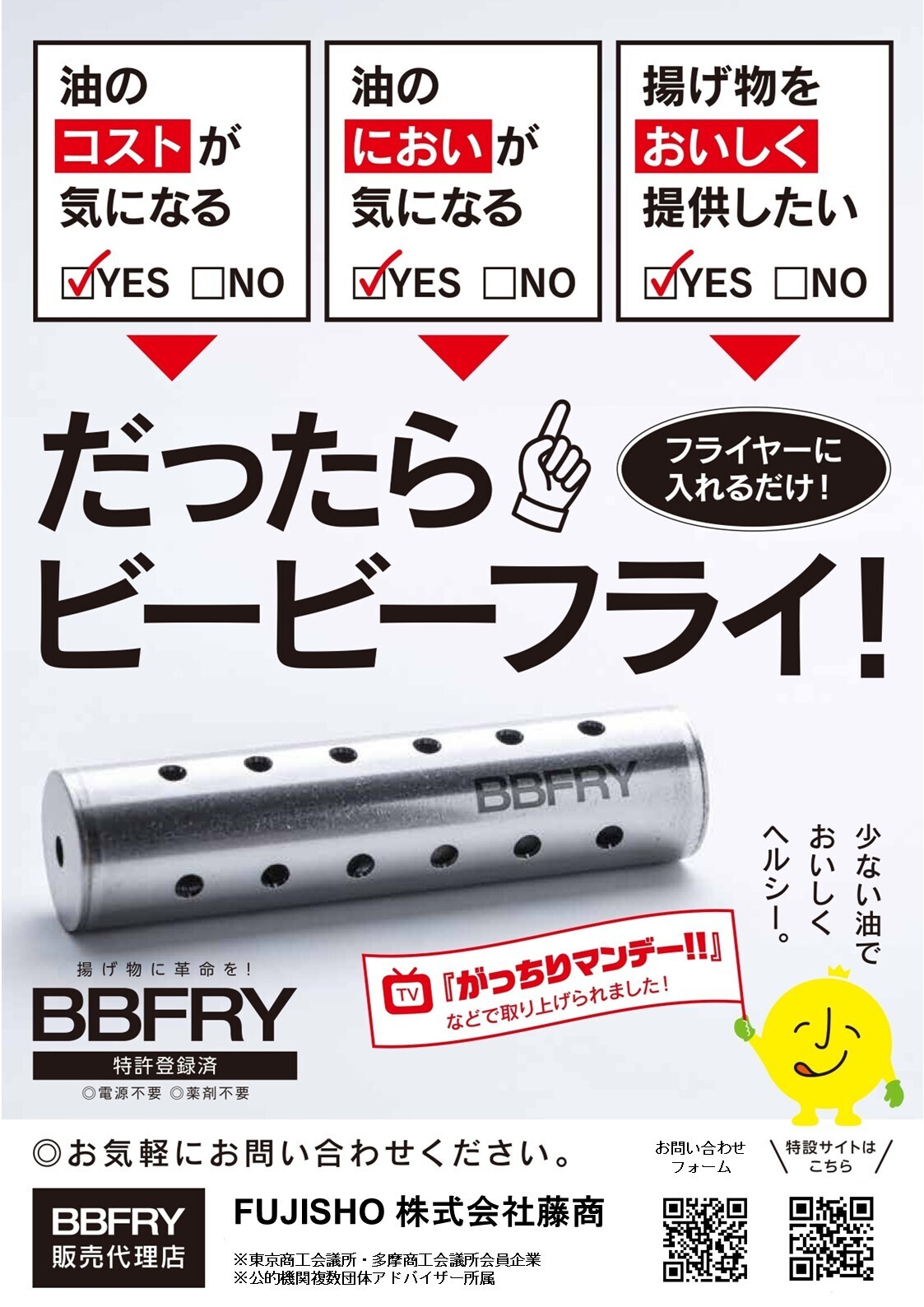 電源不要、薬剤不要で揚げ物油を削減する技術「BBFRY」の導入を希望される飲食店様や飲食店様向けに「BBFRY」の導入を支援される企業様、「BBFRY」の普及に協力して頂ける皆様と共に取り組みの輪を広げて行く活動を開始します。