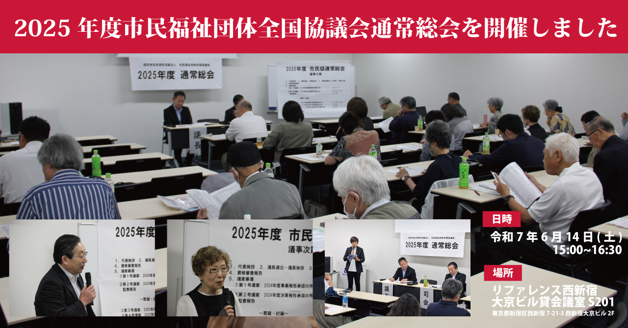 2025年6月14日(土)、リファレンス西新宿大京ビル貸会議室S202(〒160-0023 東京都新宿区西新宿7-21-3西新宿大京ビル2階)にて、2024年度認定特定非営利活動法人市民福祉団体全国協議会通常総会を開催しました。