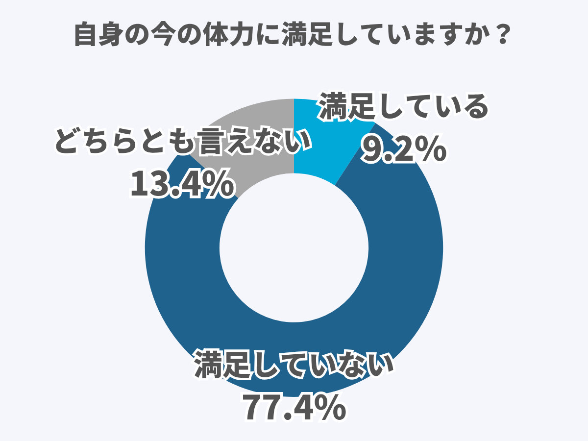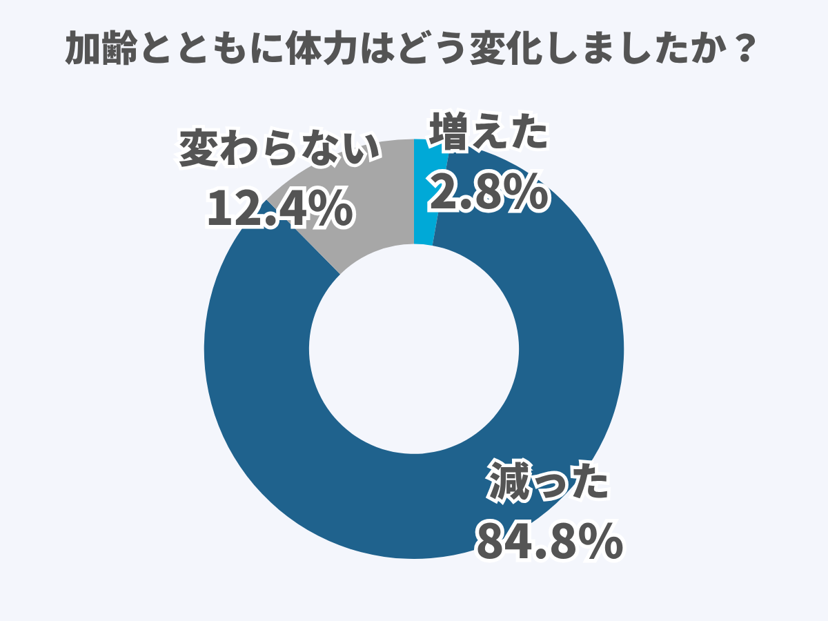 「現在の体力に満足していますか?」という設問では「満足していない」が77.4%、「加齢とともに体力はどう変化しましたか?」という設問では「減った」が84.8%と、多くの男性が加齢による体力の衰えを実感しています。