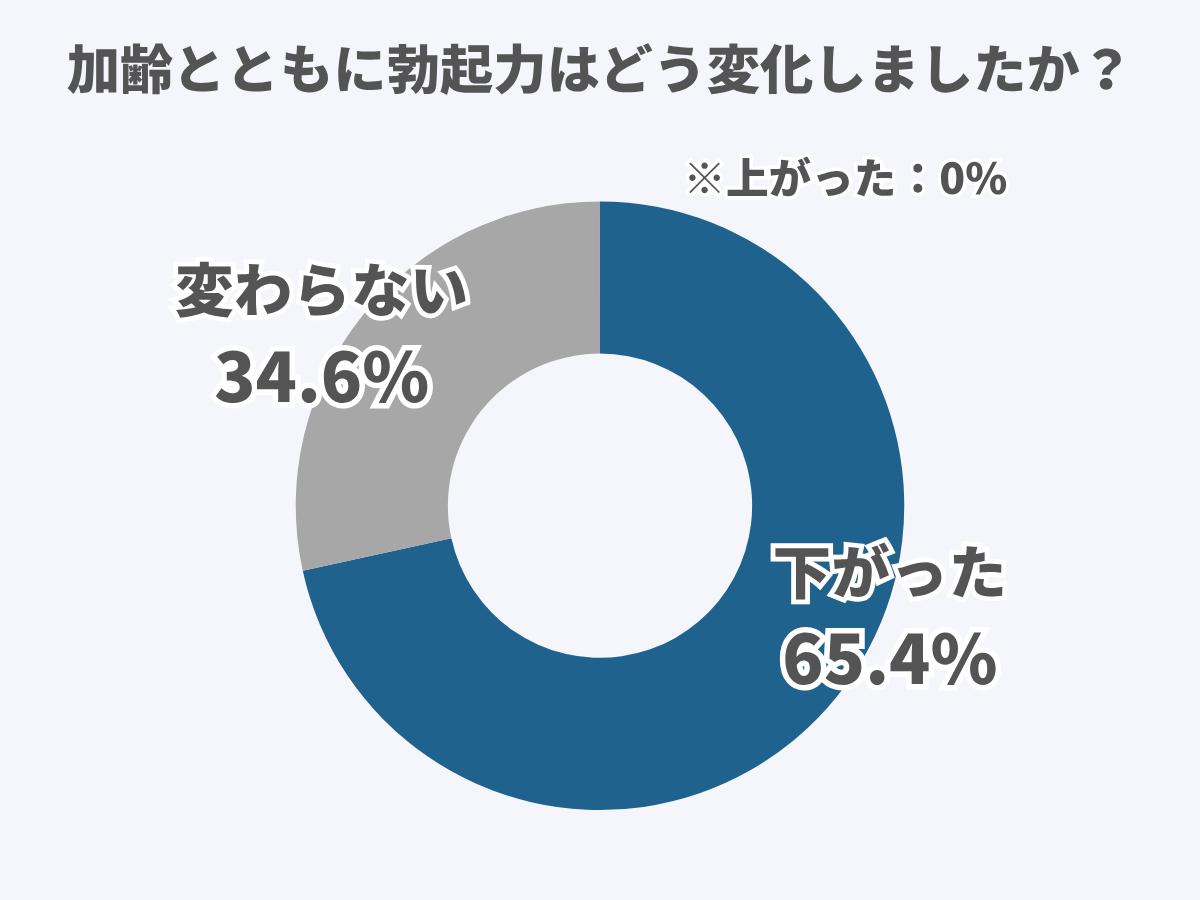 「現在の勃起力に満足していますか?」という設問には、52.6%の男性が「満足していない」と回答しました。さらに「加齢とともに勃起力はどう変化しましたか?」に対しては、「下がった」との回答が65.4%となりました。