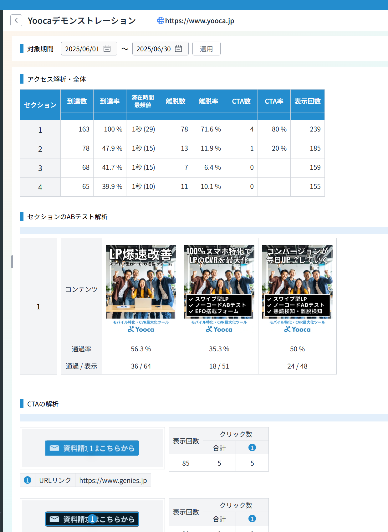 セクション毎の到達率、離脱率、滞在時間を自動測定