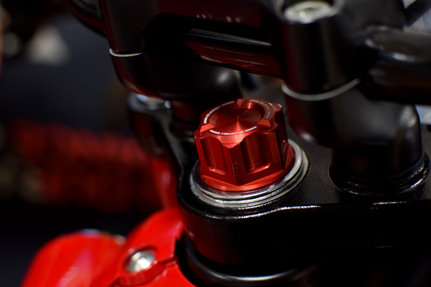従来、純正では無骨な鋼製ナットや樹脂キャップが採用されていた部分を、高精度CNC削り出しによってビジュアルと剛性の両立を実現。トップブリッジやメーター周辺と調和するデザイン性を追求した新アイテムとして開発しました。