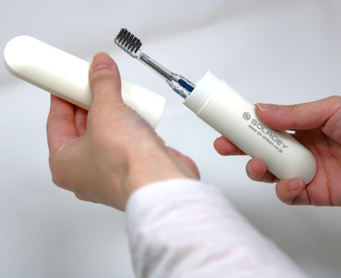 2004年に登場した「ソラデー3」は、ソーラーパネルと半導体(酸化チタン)を搭載した“光と水で磨ける歯ブラシ”として多くの反響を呼び、年間約30万本を出荷しました。次世代モデルの登場とともに生産終了していましたが、機能性・耐久性ともに評価の高かったこのモデルを、初めての方にも使いやすい価格で“復刻版”として再リリース、そして持ち運びに便利な専用ケース付きでご用意いたしました。