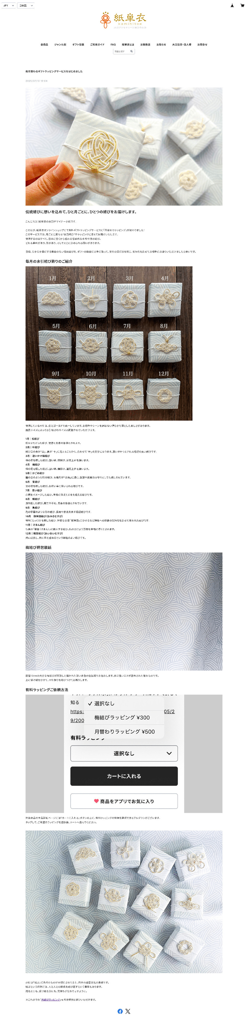 日本の伝統的な水引結びを、現代の贈り物に。和の手仕事と控えめな美しさで知られるブランド「紙単衣(かみひとえ)」は、2025年7月よりオンラインショップにて、「月替わり水引ギフトラッピング飾り」サービスを開始いたしました。ひと月ごとに異なる水引の伝統結びを添え、贈り物に願いを込めます。