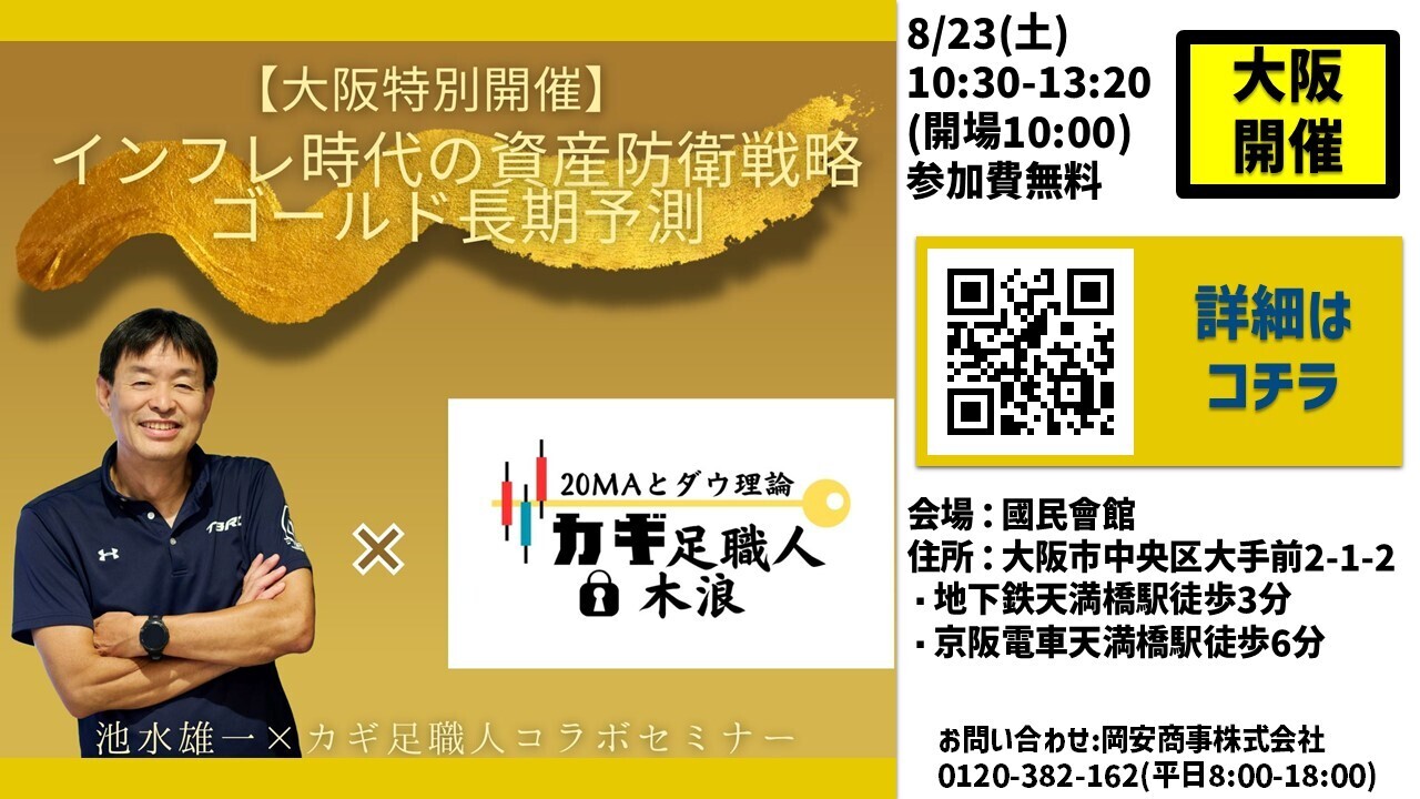 金融商品取引サービスを提供する岡安商事株式会社(本社:大阪市中央区、代表取締役社長:杉本良隆)は2025年8月23日(土)、大阪市中央区・國民會館にて、特別セミナー『インフレ時代の資産防衛戦略 ゴールド長期予測』を開催します。