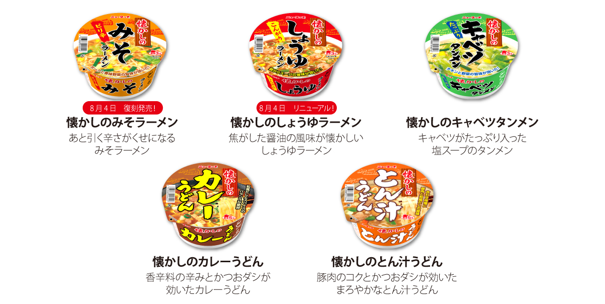 「懐かしの」シリーズは「昔食べた即席麺の味」をコンセプトとし、現在全5品を販売中です。