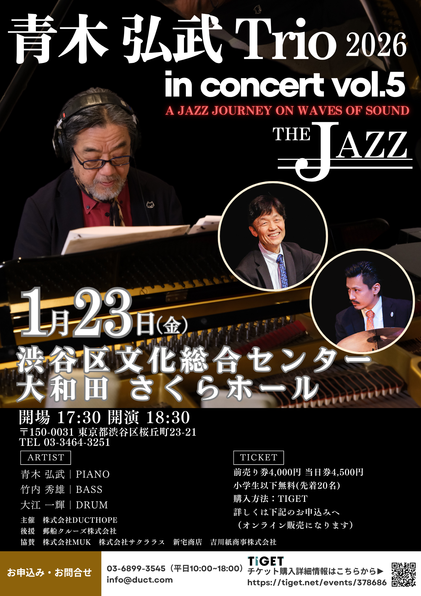 ジャズは旅だ。行き先を決めず、風のままに進む自由な旅。旋律が潮風となり、ベースが波をつくり、ドラムが鼓動を刻む。その瞬間にしか生まれない音の流れに身を任せたとき、心はどこまでも遠くへ運ばれていく。好評につき第5回を迎える「青木弘武Trio in concert」。今回のテーマは“クルーズ”豪華客船も、揺れる波も必要ない。ピアノ、ベース、ドラムが織りなすリズムとハーモニーだけで、さくらホールは広大な海へと変わる。即興で交わされる音の対話、波のようにうねるリズム、次の瞬間、どこへ向かうのかは誰にもわからない。それがジャズの醍醐味だ。たった一夜の音楽の航海。あなたも、この旅の乗客になりませんか?音楽が舵をとる夜。さあ、JAZZの旅へ—。ジャズの世界に深い足跡を残してきたベテランジャズピアニスト青木弘武が、ピアノトリオコンサートを開催いたします。