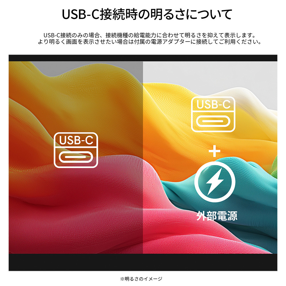 入力端子としてハイブリッド対応(モニターへの電源と映像を1本で送信)のUSB-Cを2つとminiHDMIを1つ装備します。※miniHDMI使用時にはUSB-C端子から電源供給が必要になります。