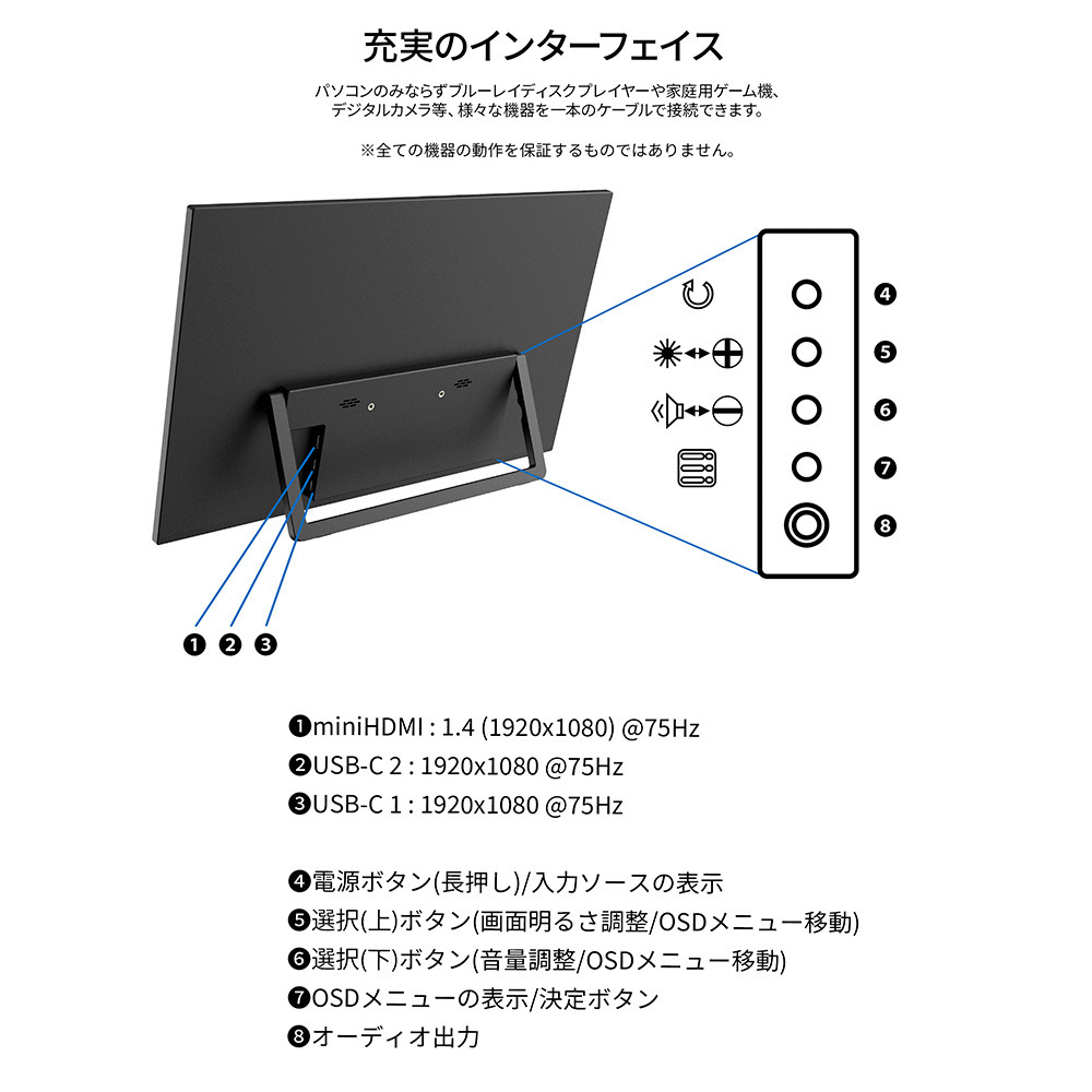 | 入出力端子 | USB-C x2 (75Hz) miniHDMI x1 (75Hz) オーディオ出力 x1 |