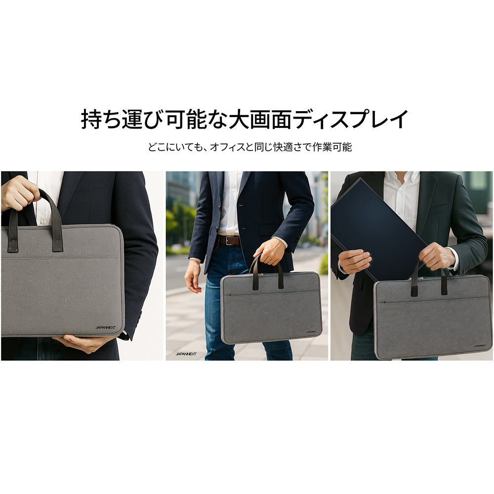 モニター背面にキックスタンドを搭載しているので自立して使用することができ、どこでもデュアルディプレイ環境の構築が可能です。また、携帯時に便利なJAPANNEXT特製キャリングケースを同梱。製品本体をホコリや傷から守り、持ち運びに最適です。