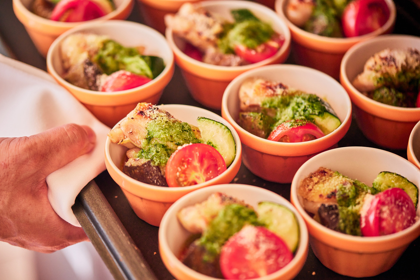 その他にも、ライブキッチンで仕上げる『千葉県産「錦爽(きんそう)どり」と野菜のエスニックバター焼き』は、香ばしさと旨みが広がる熱々オーブン料理。マリネした鶏肉を低温調理し、ズッキーニ・なす・トマトなどの夏野菜と一緒にエスニックバターで焼きあげています。