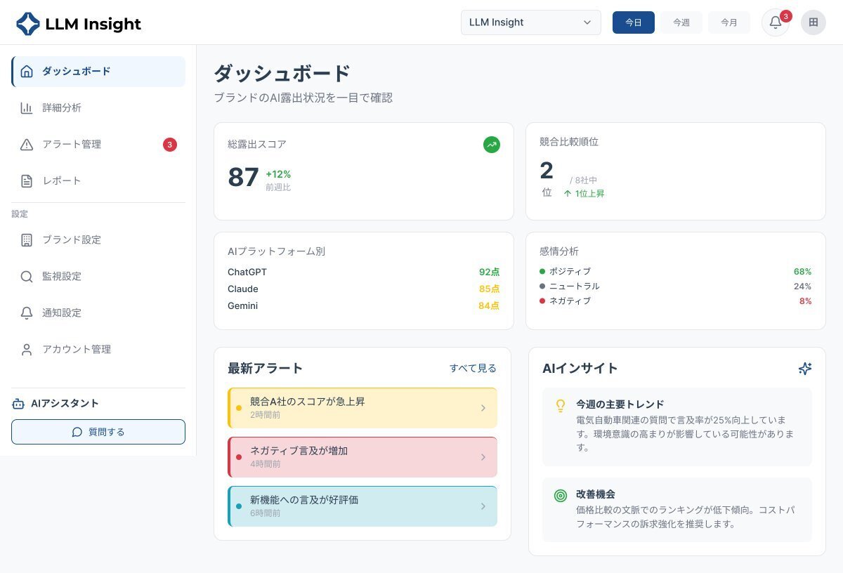 【LLM Insight】は、この課題を解決するために開発されたSaaSツールです。主要なAIプラットフォーム上での自社・競合のブランド露出状況を定点観測し、直感的なダッシュボードで可視化します。