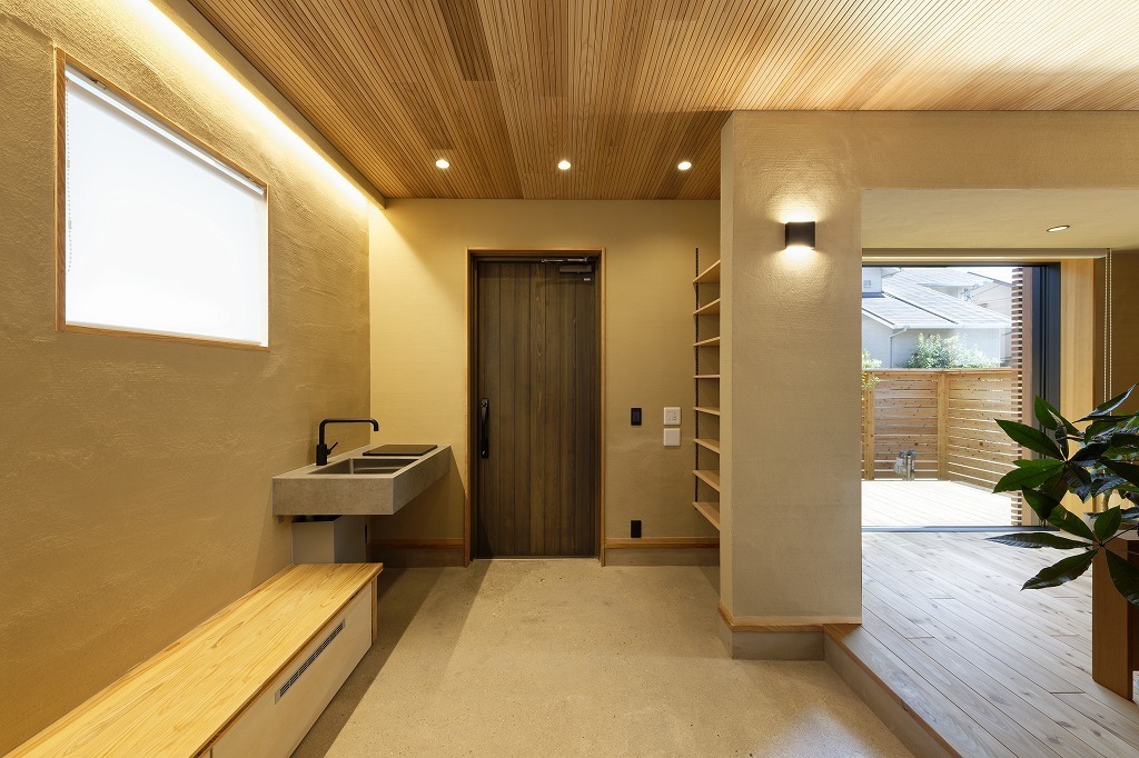 風通しが良く明るい空間には間接照明も設け、日中だけでなく夜の時間も楽しめます。階段の段差は低く抑え、老若男女問わず安心して暮らせるお家に。また外壁には質感の高い手塗りのそとん壁を採用したほか、家の中は自然素材をふんだんに使い、空気環境にも配慮しています。