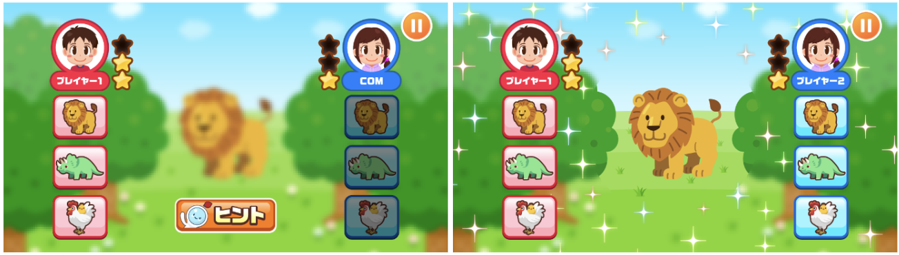 本ゲームは、コンタクトレンズ(ヒント)を使いながら、横切るアイテムを当てる早押しゲームです。ゲームを進める中で、アイテムがはっきりと見えるようになる体験を通じて、コンタクトレンズの効果を楽しく実感できます。コンピューター対戦か2人で遊ぶモードが選べます。(※)