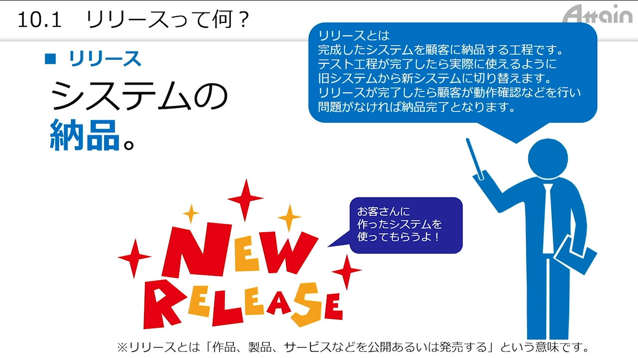 コンピュータートレーニング教材制作、eラーニング向けコンテンツ制作のアテイン株式会社(本社:東京都江東区、電話:03-6381-8641、代表:福嶌崇臣、資本金:1億1470万円)は、法人向けのeラーニングコンテンツ年間レンタルサービスに新たなラインナップとして、システム開発についての基礎が動画で学べる「システム開発基礎講座」を、8月20日に提供開始します。