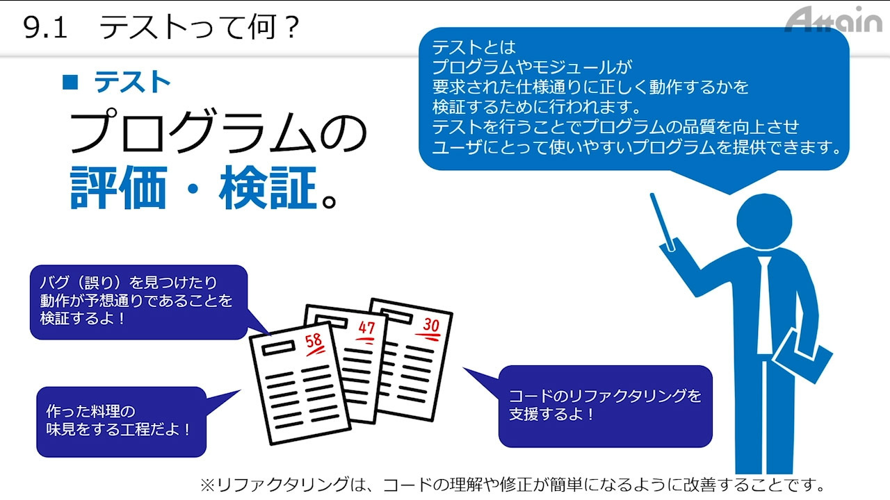 章毎に確認テスト問題も付属しており、十分に復習して自分の理解度を確認できます。また、動画内で使用した講義スライドが付属しますので、こちらも復習に活用することができます。